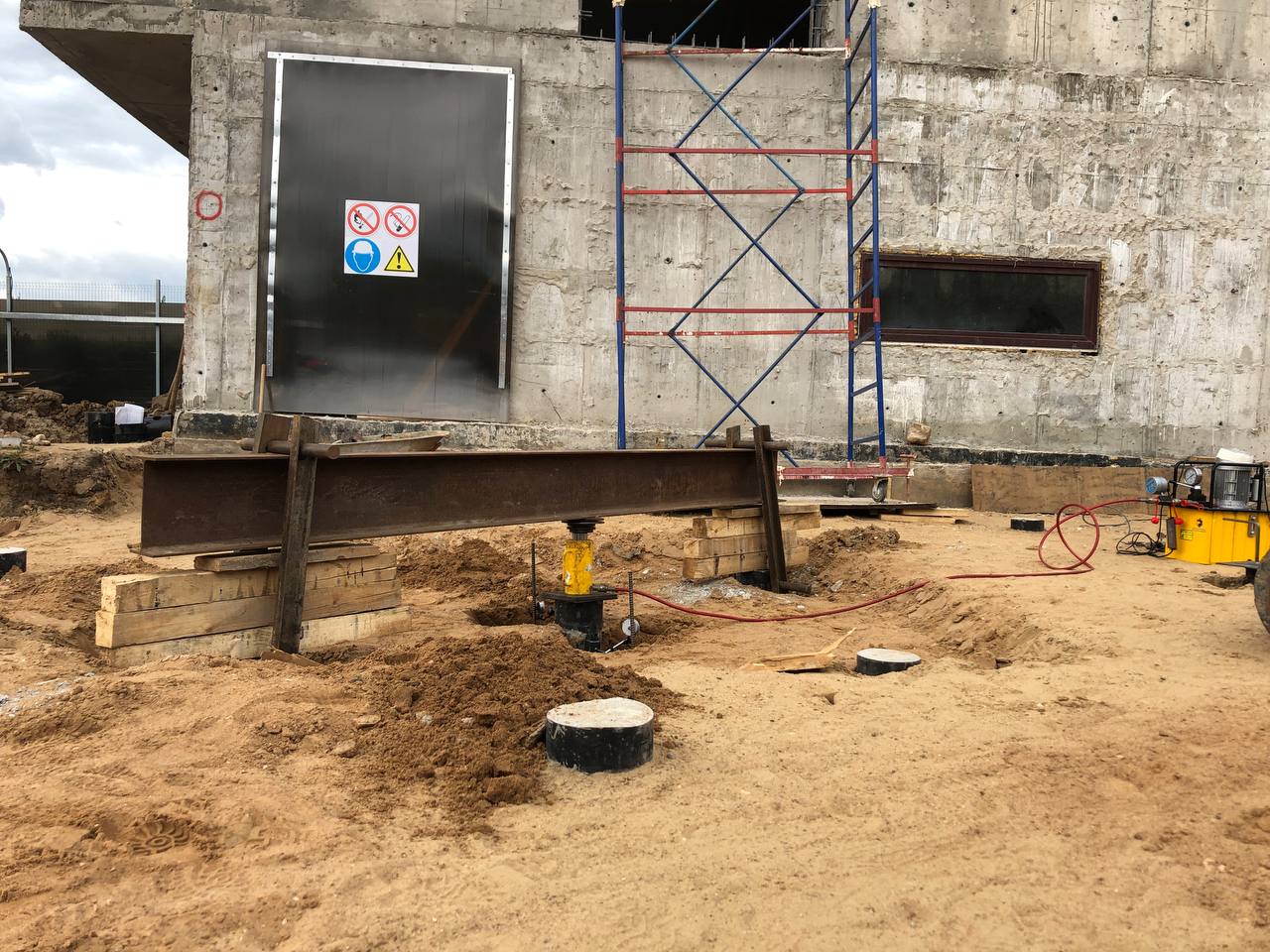 - Нагрузочное испытание свай статикой проводится с помощью гидравлического домкрата и реакционной системы.